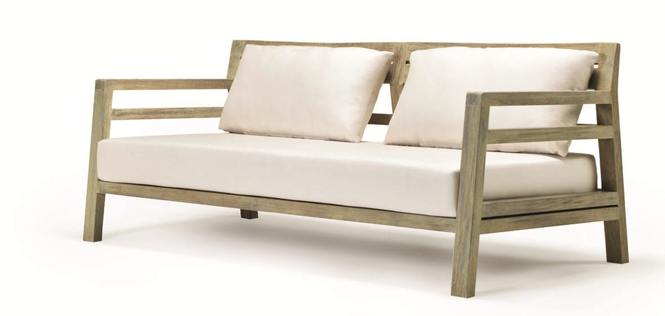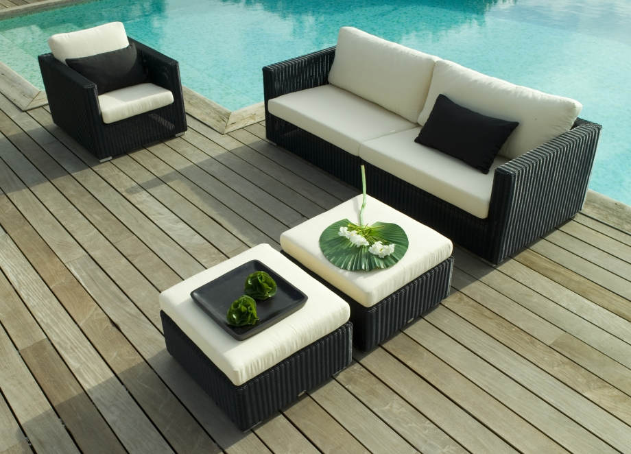 The pool and wooden floor have a nice feel around the sofa.