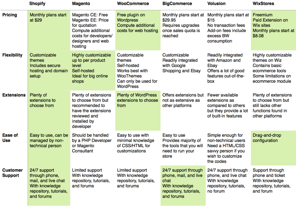 Here’s a quick cheat sheet of what we think works and what we think is the best of the 6 platforms when it comes to Pricing, Flexibility, Extensions, Ease of Use, and Customer Support. Click to enlarge.