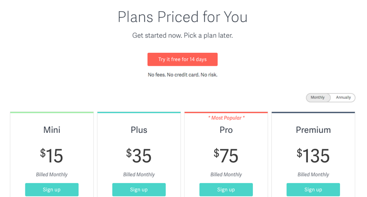 Try Volusion risk-free for 14 days and if you’re satisfied with how the platform works, upgrade to any of the 4 plans. Volusion has a straightforward pricing plan starting from $15 a month for the Mini Plan up to $135 for the Premium Plan.