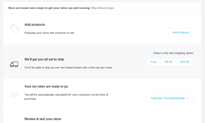 Below is a sample setup page. The platform lays out all the initial activities that you will need to accomplish before you can run your store.