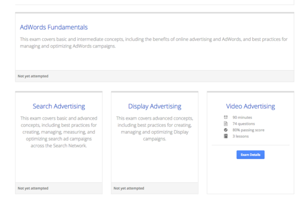 The following exams focus on testing your knowledge on creating, managing, measuring, and optimizing specific advertising campaigns: