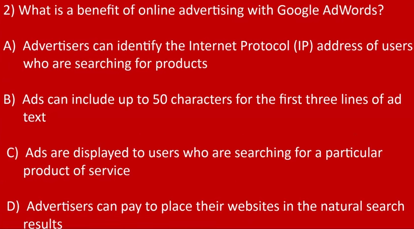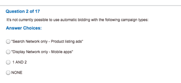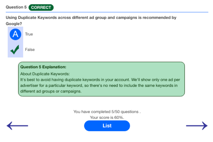 Here’s another good site to test your AdWords Fundamentals knowledge. The good thing about this site is that you can immediately find out if you’re right or wrong, including an explanation of the answers as well as your current score.