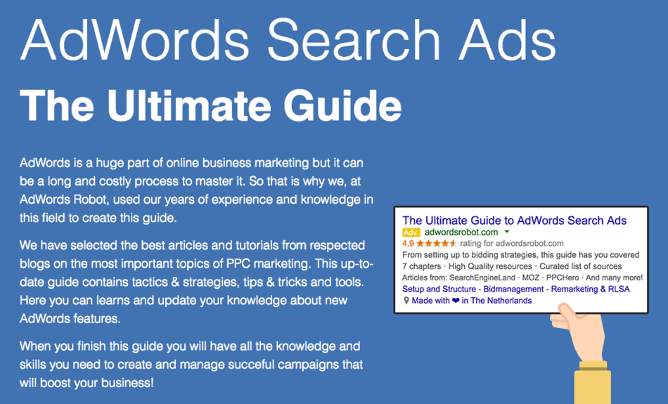 This up-to-date guide contains tactics & strategies, tips & tricks and tools. Here you can learn and update your knowledge about new AdWords features.