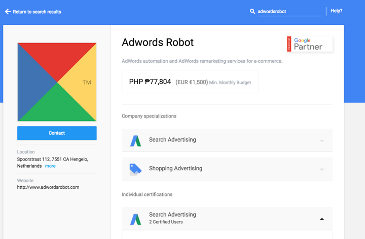 If you are employed in an agency, your clients will see the benefits of working with a Google Partner agency. These include having first-hand access to Beta features, a quick line to Google Support, and having the assurance that the agency they hired is using all the Google AdWords best practices in the industry.Partners are featured in the Google Partners listings site. Clients can validate your Google Partner/Premier Partner status on the site. Here’s Adwords Robot’s profile: