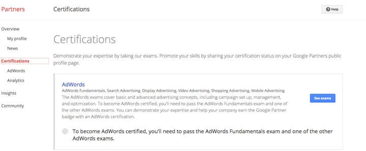 Select Certifications. You will see all the exams available for you such as Adwords and Analytics. Click on the See exams button.