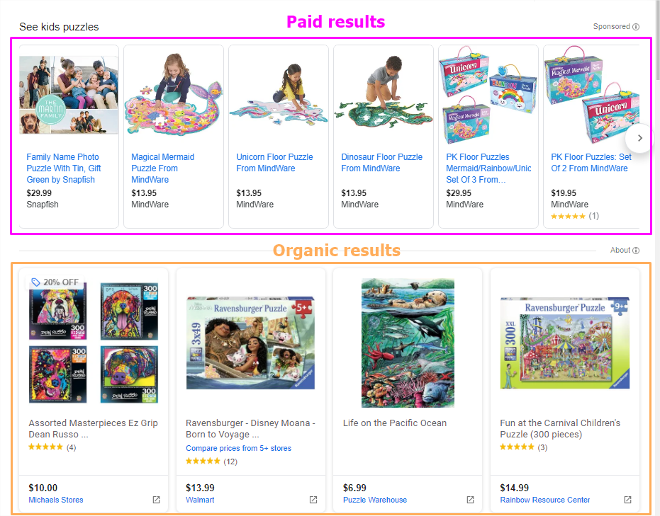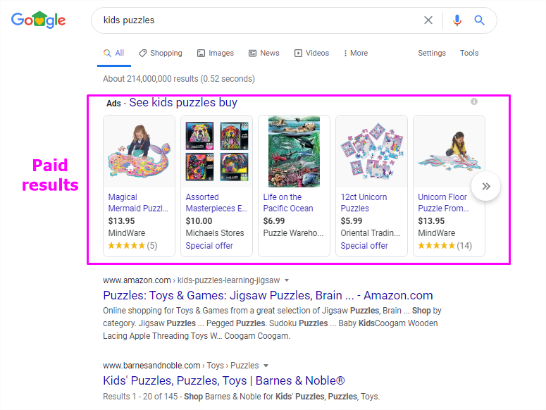 For example, if we are searching for ‘kids puzzles’, the Shopping Ads that we see in the ‘All’ results page, are only paid Shopping results.