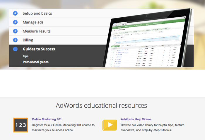 A new section is added to the header “Guides to Success”. Here you will find instructions, tutorials and tips to get the most out of your Adwords account.