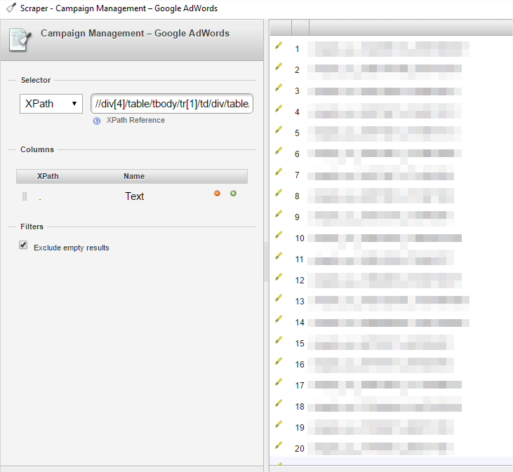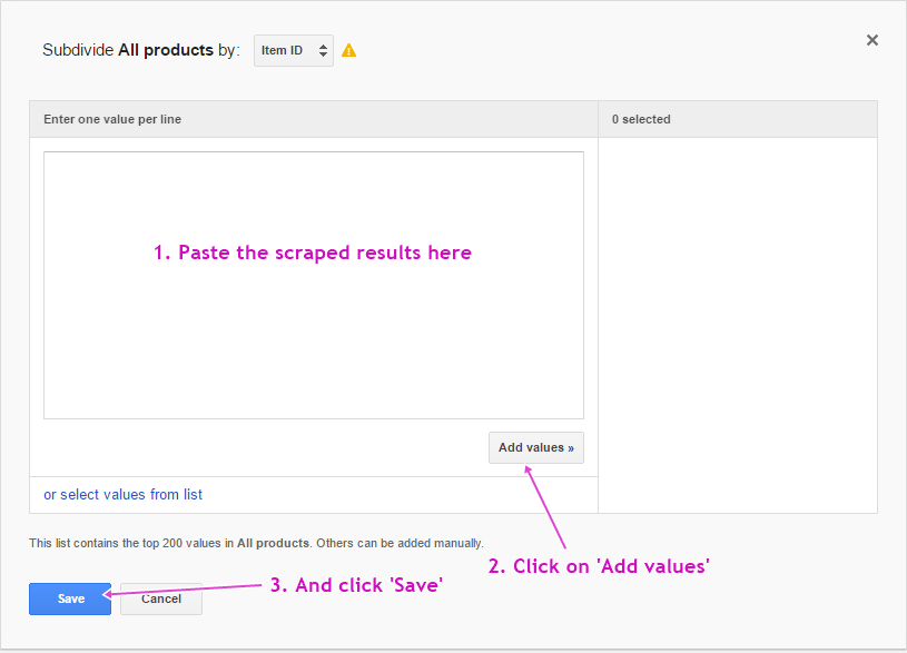 After you run the scrape tool with the new syntax, it will only show the values contained in the first cell of the column for all the rows you have in the table. In other words, you will have all the products ID’s that fit your filter.