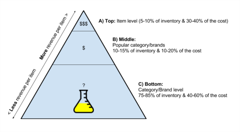 Let's look at the pyramid below. Simply said, there are 3 product segments: (A) products which generate most sales, (B) products which individually are not performing amazing, but are part of a popular brand or a popular category and (C) products for which you just have no idea, because they don't get enough traffic to make a decision.