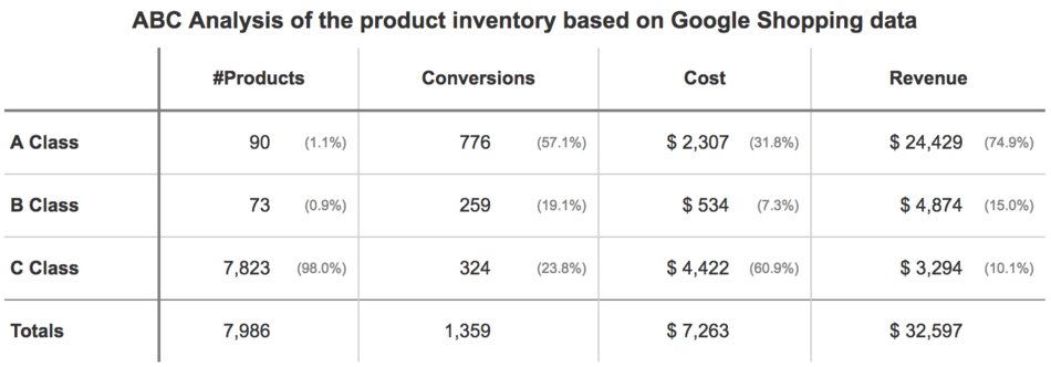By concentrating on Classes A & B in your campaigns you can focus on 10-25% of your product inventory which generates 90% of the revenues. This way your budget and your time best spent.