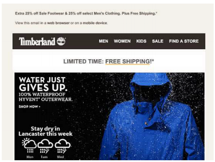 Aside from practical applications in the insurance and healthcare industries, this particular strategy works for retail too. Timberland uses 3-day forecast data to pick the right product to advertise to their customers.