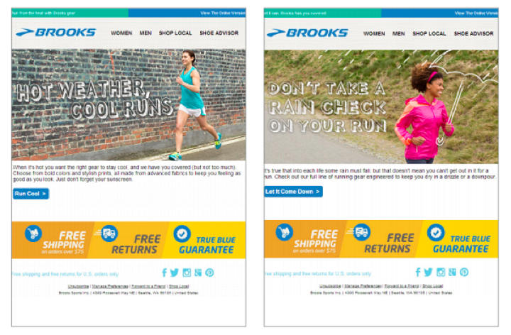 Use analytics to send out weather-specific emails to your clients. Email on Acid cites this particular campaign from an athletic shoe company, Brooks, as one that makes good use of weather data.