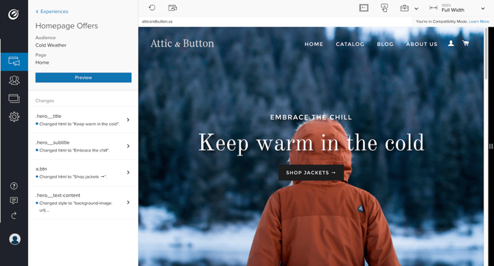 Weather data is one way to inject personalization on your website. The example below shows a website display targeted for users in specific cold locations. Attic & Button takes advantage of this too by emphasizing their outerwear collection on the site’s banner.