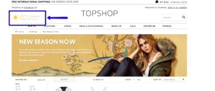 Brands looking to increase sales outside of their current collection can utilize weather diversity. Topshop, while offering a fall/winter collection, still speaks to customers in sunnier locations through a small banner on their website. This allows the brand to sell both their current collection as well as their summer apparels.