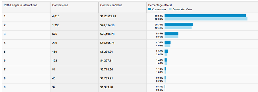 In this tab page you can view how often your customers get to your site and through which channels before they convert. More interactions denote a longer “sales cycle”. When only one interaction is needed before converting, you have to deal with impulse buying.