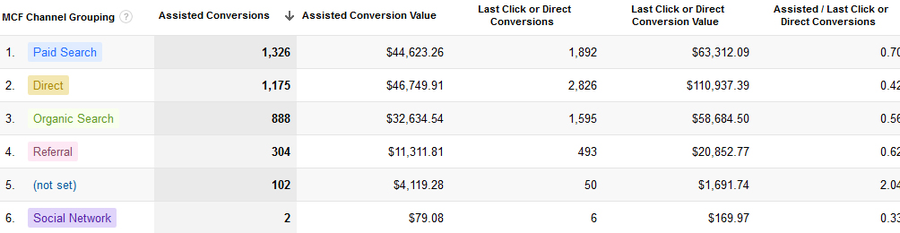 Here you can see your marketing channels with the associated profits. Personally I believe it’s difficult to understand how these amounts arise, but there is a nice ratio in this list: “Assisted / Last Click”. You can find it all the way to the right.
