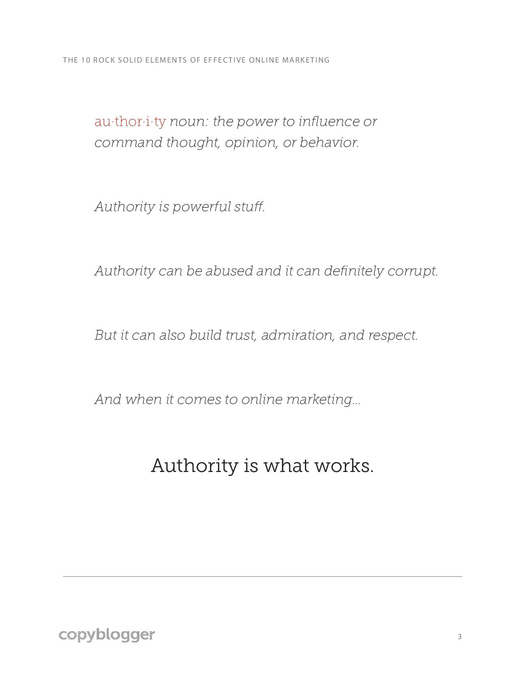 E-book summary: In this book you will learn ten keys to building authority respected both by Google and your peers. Learn to find your winning difference, teach instead of selling, write catchy headlines and hooks, and how to harness the power of friends and the opinions of your peers. You will also touch on the importance of the almighty mailing list, proper SEO strategies, writing code Google loves, site design, and community leadership. All of this and other resources to help you achieve your goals. Get the e-book