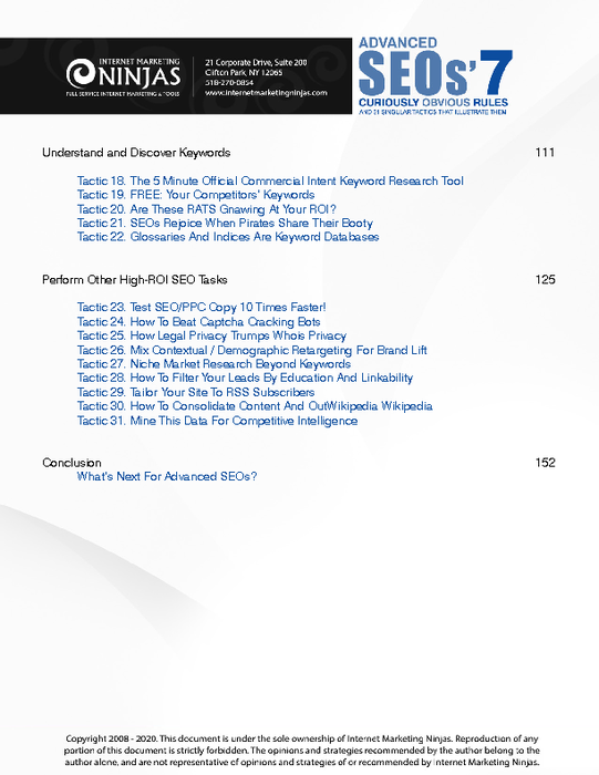 E-book summary: In this book you will learn seven easy to apply rules to improving your SEO. You will learn the importance of constantly learning from others, teaching yourself, your study patterns, and lateral thinking. You will also get to study many tactics on the topics of conversions, link building, understanding and discovering keyword, and many other high ROI SEO tasks to give you maximum results with minimum investment! Get the e-book