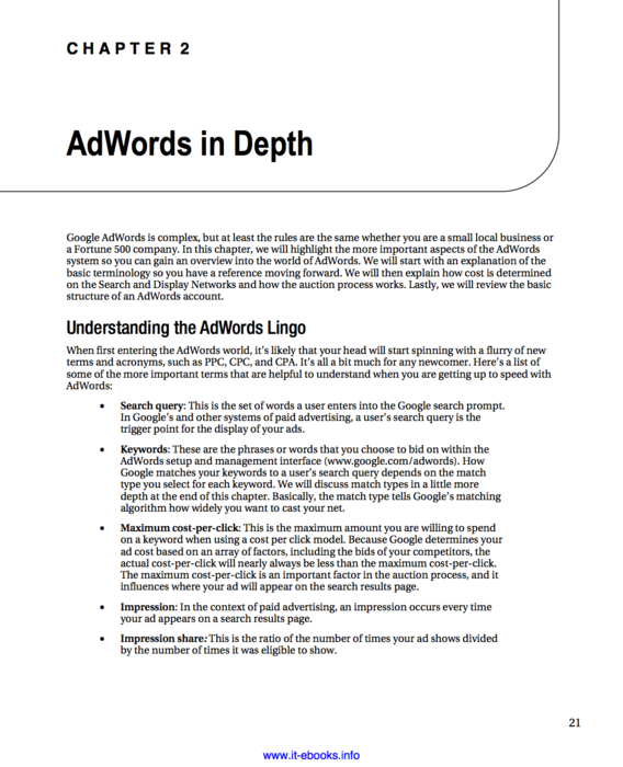 E-book summary: In this book you will learn everything there is to know about Google AdWords. You will cover SEM and the Google ecosystem, local advertising and location targeting, several different ad models, keyword strategies, how to create effective ads and landing pages, advertising on mobile platforms, how to properly and effectively use Google Analytics, and how to test the results of your campaign with Website Optimizer. Understand all of the data available to you in Google Analytics to maximize your results and minimize your efforts. Get the e-book