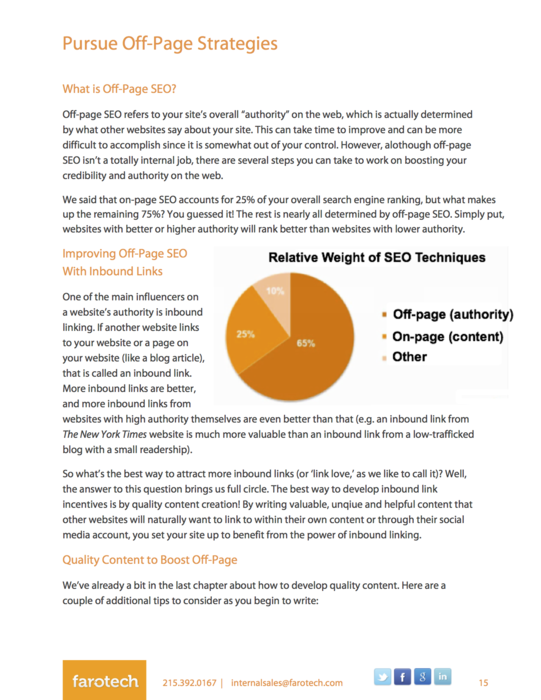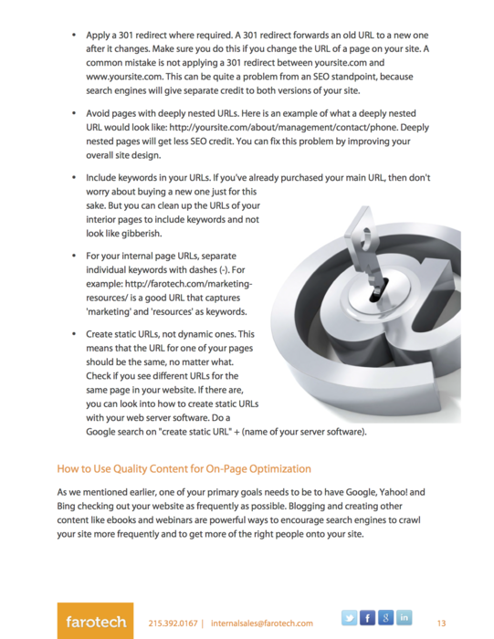 E-book summary: In this book you will learn the 5 steps to perfecting the SEO process. First, understand what search engines offer you in terms of traffic, and what search engines want from you to get that traffic. Develop a fantastic keyword strategy and learn the difference between short and long tail keywords. Tackle on page SEO including 9 on page techniques to optimize your site, then pursue your off site strategies. Track, and analyze your results to improve in the future and maximize your results! Get the e-book
