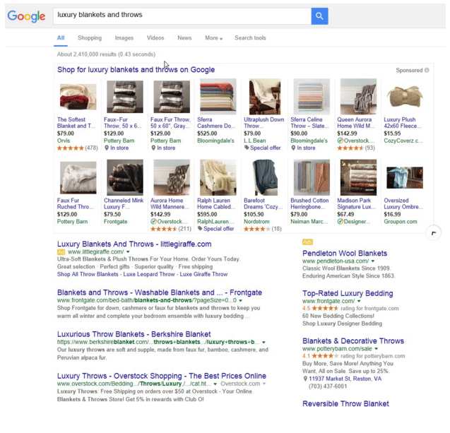 When searching for a product, between 4 and 16 products appear in the search results. These shopping results are usually above the text advertisements and are therefore clearly visible. You also see the product photo and price and potentially reviews of the store, whether the product is discounted, the name of the store, etc.
