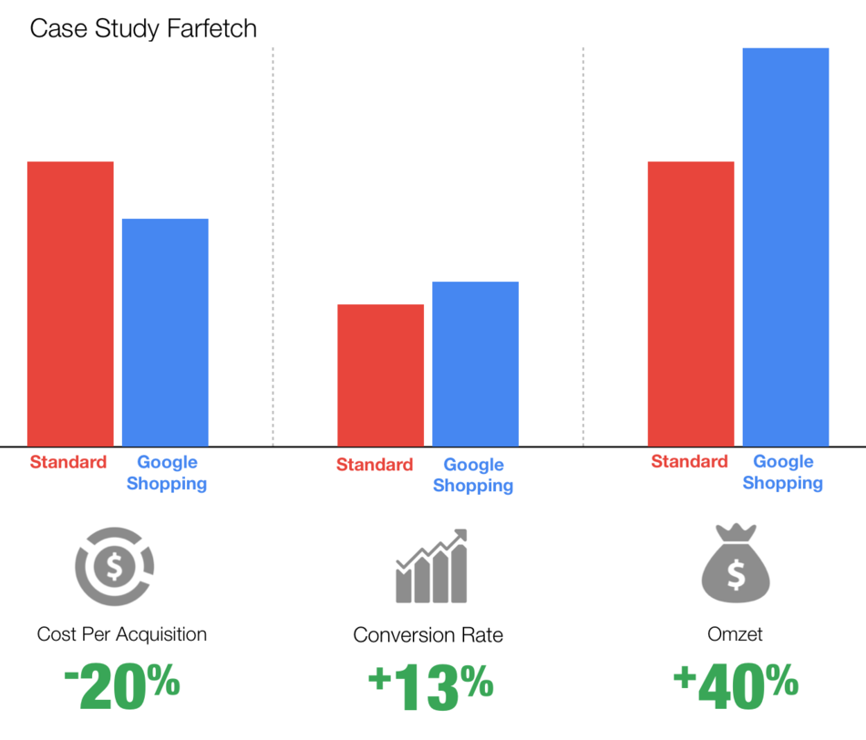 Farfetch is a fashion chain from London with a big web shop. Through the use of Google Shopping in 4 countries they have increased their revenue by 40%. Their conversion rate rose by 13%, and the click-through rate also rose. The costs also dropped considerably, next to the cost-per-click their cost-per-acquisition also lowered by 20%. [case study]