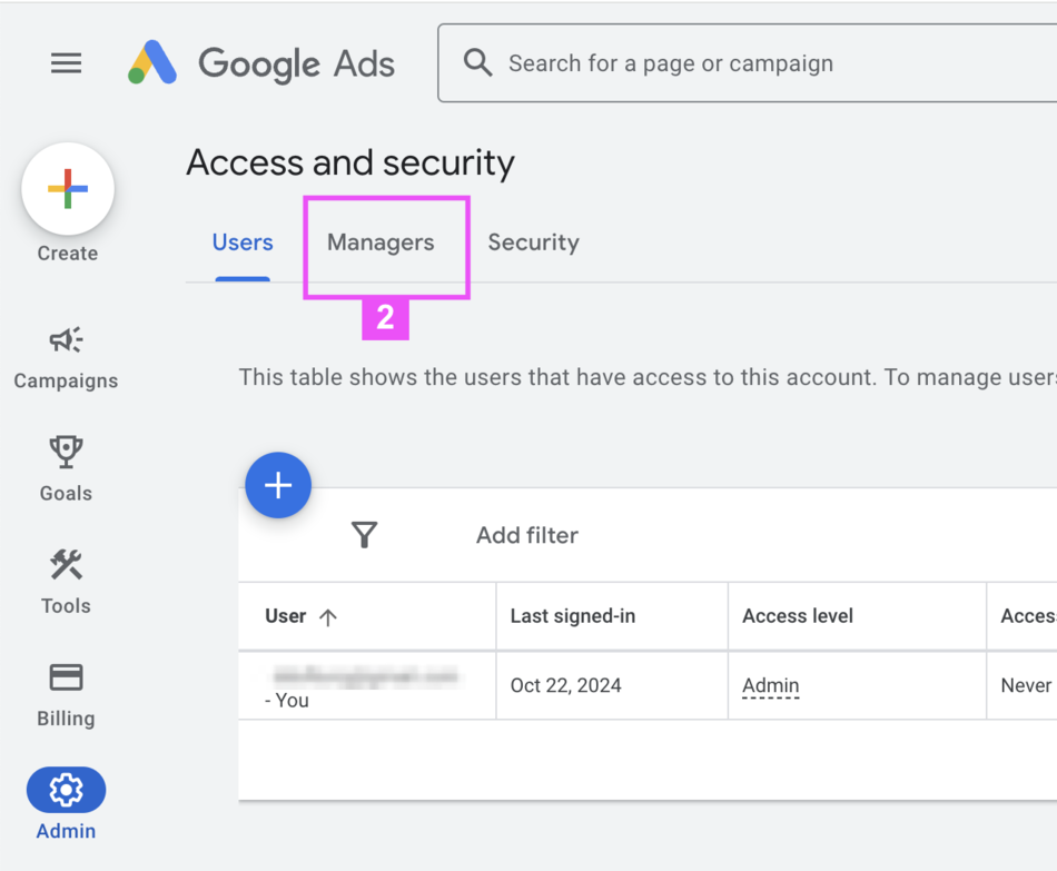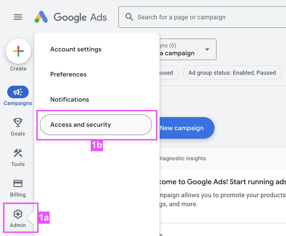 Click on the [1a] Gear-icon on the left menu and then on [1b] Access and security.