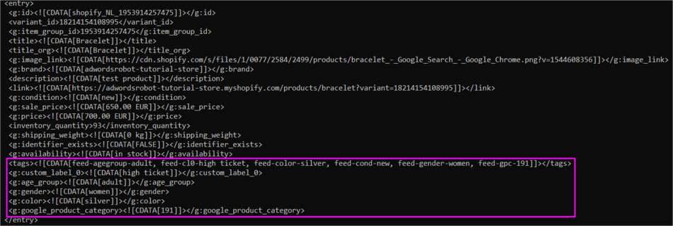 | Shipping Label | feed-sl-XXX | (any value) | These values will be shown in Google Merchant account in shipping settings. |