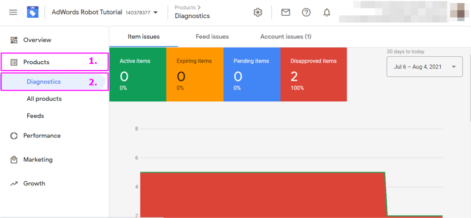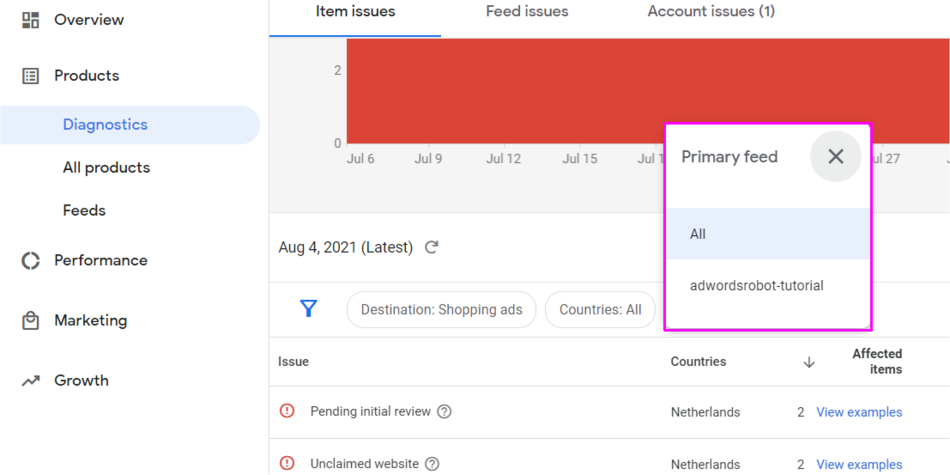 To check the errors and warnings, go to the Diagnostics tab in your Google Merchant account