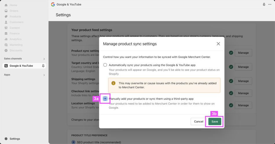 Then choose [3a] Manually add your products or sync them using a third-party app and then [3b] Save.