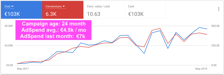 2 year old campaign with steady growth over time keeping the cost / conversion at the same rate.