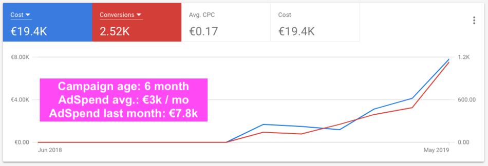6 months old campaign with steady growth over time keeping the cost / conversion at the same rate.