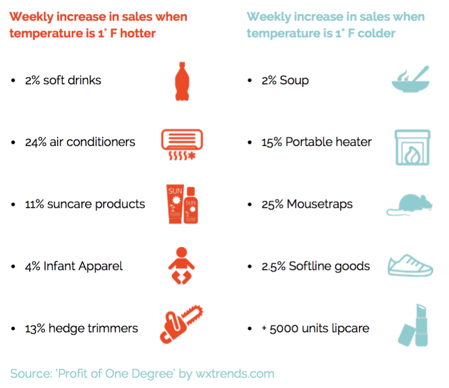 Also, sales change when temperature changes. Weather Trends 360 reports that just one degree could make a difference.