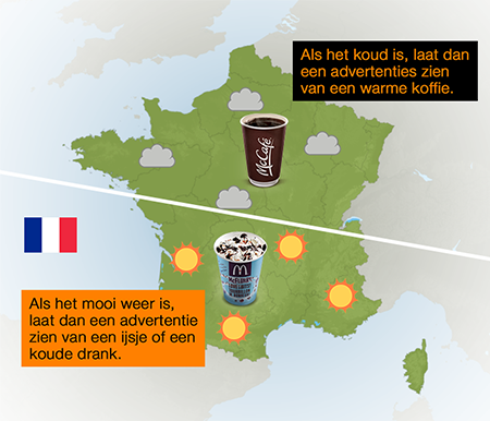 Bijvoorbeeld als het zonnig weer gaat worden aankomend weekend in het zuiden, zal een advertentiecampagne van een supermarkt effectiver zijn als het een advertentie van barbecueproducten toont ipv. generieke advertenties.