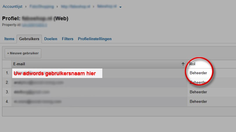 Indien dit niet het geval is, voeg dan nu eerst uw Adwords email adres toe met de knop “+ Nieuwe gebruiker”.