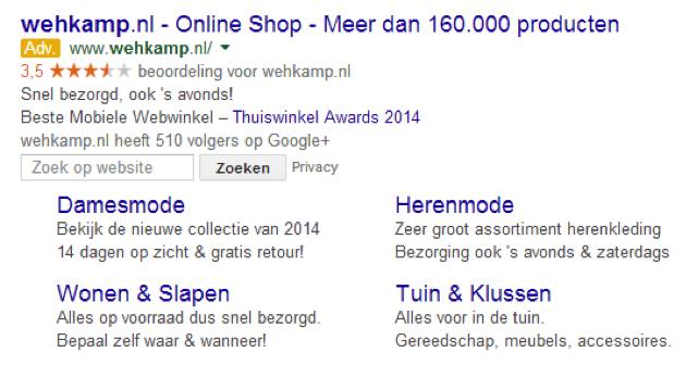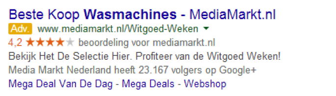 Veel bezoekers hechten waarde aan klantbeoordelingen bij het kiezen van een aanbieder. Google introduceerde hiervoor de seller ratings als extra extensie bij je advertentie. Maar het is natuurlijk ook mogelijk om in je advertentietekst naar klantbeoordelingen te verwijzen. Een goede manier om te laten zien dat klanten tevreden zijn en een hoge waardering geven voor je product.