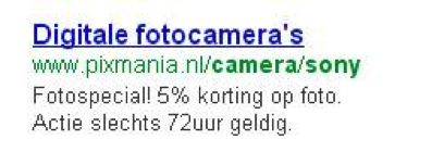 Een advertentieregel van een AdWords-advertentietekst mag maximaal 35 tekens bevatten. Probeer uit wat beter werkt: het optimaal benutten van de beschikbare tekens of juist zo weinig mogelijk tekens te gebruiken onder het motto ‘less is more’.