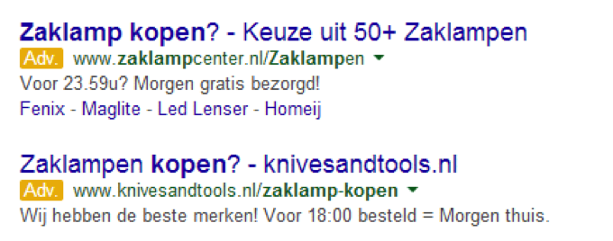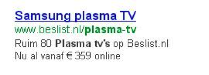 Het gaat er om dat je advertentie opvalt tussen de andere advertenties. Stel hiervoor bijvoorbeeld een vraag in de kop van de advertentie. Speel met de vraag in op de zoekopdracht en beantwoord de vraag in de advertentie tekst.