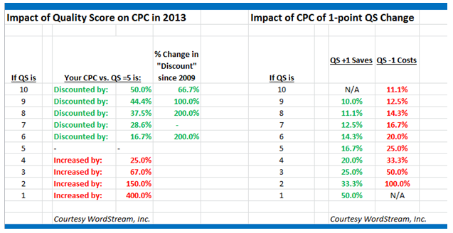Het belangrijkste: Hoe hoger uw Quality Score, hoe groter uw CPC korting. Omgedraaid, lagere Quality Scores resulteren in veel hogere kosten per klik. Beschouw het als een CPC belasting voor het runnen van domme advertenties .