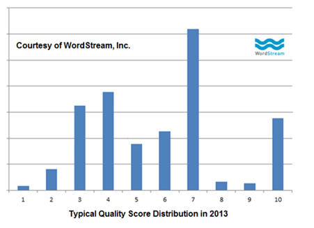 Als u perfecte tienen hebt op al de Quality Scores van uw zoekwoorden, laat het ons dan weten, want dit moeten wij nog zien in een account. Meestal zult u een mix krijgen. Larry Kim heeft honderden accounts geanalyseerd om uit te vinden hoe de typische Quality Score verdeling er uit zag in 2013 en vond uit dat 7 de meest voorkomende score is.