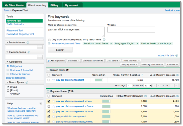 Hanapin target mensen die management voor hun PPC accounts nodig hebben. Wanneer iemand echter nog niet ervaren is in deze industrie, kan het zo zijn dat ze geen gebruik maken van de termen ‘pay per click’ of ‘paid search’. Ze kunnen zoeken voor algemenere termen zoals ‘online adverteren’ of ‘internet marketing’.