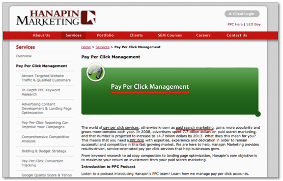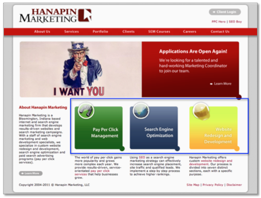 De eerste plaats waar u moet zoeken naar zoekwoorden is de bedrijfswebsite. Dit is de beste manier om de belangrijkste woorden en zinsdelen te identificeren die uw bedrijf beschrijven. Als u naar de website lay-out kijkt vind u misschien ook zoekwoord thema’s die aanwezig zijn. Laten we even kijken naar de website van Hanapin Marketing: