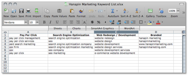 Wanneer u langs uw site gaat, vergeet dan niet om merknamen te gebruiken wanneer u uw lijst opstelt. Merk zoekwoorden zijn heel voordelig voor elk PPC account, omdat ze vaak hogere conversie percentages hebben en lagere kosten per conversie. Beneden een zoekwoordenlijst van onze site die ik in mijn Excel spreadsheet typte: