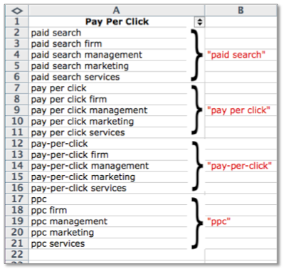 Merk wel dat ik deze nieuwe zoekwoorden heb toegevoegd aan de andere pay per click variaties die ik eerder al gevonden heb. Ik heb ook mijn originele pay per click lijst opgebroken in subcategorieën. Ik probeer zo georganiseerd mogelijk nieuwe zoekwoorden lijsten te maken omdat dit het instellen van uw AdWords account vergemakkelijkt.
