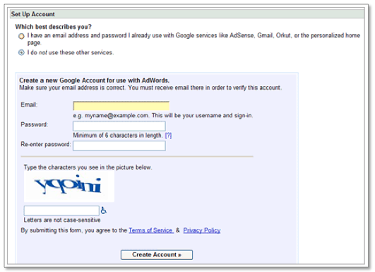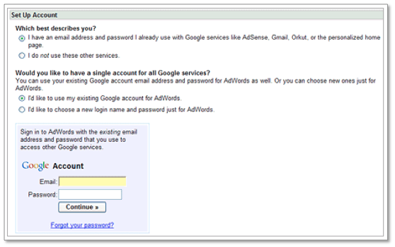 Wanneer u de eerste drie stappen voltooid heeft en uw ingaven heeft gecontroleerd, moet u uw Google account email adres en wachtwoord ingeven. Er zijn hier twee opties – u kunt registreren met een bestaand Google account of een nieuwe aanmaken. Het hangt ervan af van waar uw voorkeur naar uitgaat. Wij raden aan een andere mail account op te zetten voor specifiek AdWords. Zo, wanneer er meer mensen in het account werken, hebben ze geen toegang tot uw persoonlijke email.