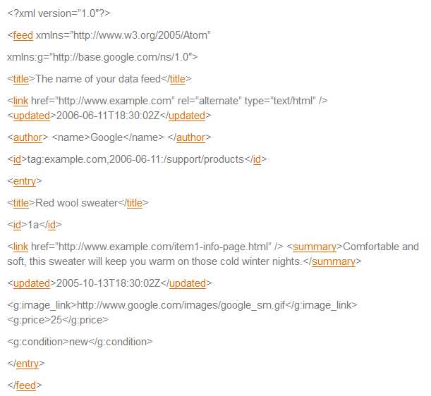 In vergelijking met RSS 2.0 vereisen de Atom 1.0 data feeds vijf elementen in het begin – titel, id, link, samenvatting en updated. Om ook hier extra vereiste elementen toe te voegen heeft Google ook Atom 1.0 uitgebreid met het Google Merchant Center namespace. Hier een voorbeeld van een standaard Atom 1.0 document van een enkele item: