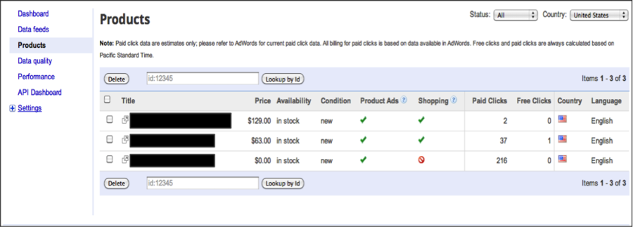 Om de kwaliteit van uw data feed te controleren gaat u naar de Products link in de navigatiebalk links in het Merchant Center. Deze pagina geeft de status van ieder product weer en geeft tot 10.000 willekeurige producten weer. Als u meer dan 10.000 producten heeft en iedere status afzonderlijk wilt zien, moet u zoeken voor hun status.