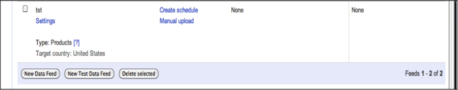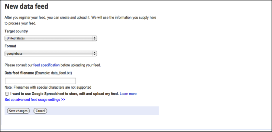 Data feeds kunnen niet worden ingediend via Google Spreadsheets. Voor deze optie kunt u of gebruik maken van de bestaande sjabloon die Google verschaft of een zelfgemaakte Google spreadsheet indienen. Wanneer u klikt op new data feed, geef dan het target land, formaat en de data feed bestandsnaam in en vink het boxje naast ‘I want to use Google spreadsheet to store’ af, bewerk en upload uw feed. De volgende stap is om of uw data te uploaden door een template feed te genereren of door een bestaande Google spreadsheet te gebruiken die de informatie van alle producten bevat.