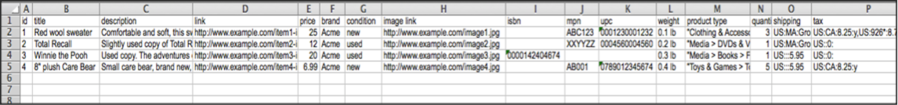 Het screenshot hierbeneden laat de spreadsheet versie van een product feed zien. De namen van moeten worden inbegrepen als headers in de eerste rij, terwijl de rijen daarna uw items beschrijven volgens de attributen. Wanneer u alle producten en bijbehorende attributen heeft toegevoegd aan de feed, moet u het bestand opstaan als een tab-gescheiden bestand.
