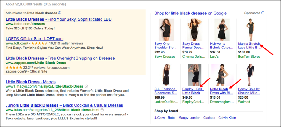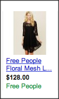 Link attribuut: Update uw links net zo vaak als uw website en zorg ervoor dat deze URL meteen naar het product op de titel, beschrijving en de afbeelding van uw PLA gaat. Beneden is een voorbeeld van hoe het niet moet. Iemand zoekt voor een zwart jurkje en deze afbeelding laat zien wat er opkwam voor deze term.